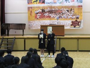 本日6校時には、全校集会を行いました。寒い中ではありましたが、先日の選挙で選ばれた「第80期生徒会正副会長の認証式」と「芸術面で受賞したたくさんの生徒の皆さんの表彰式」を行いました。受賞者の名前が読み上げられるたびに、全校生徒から暖かい拍手が起こり、とても和やかな雰囲気での表彰式となりました。