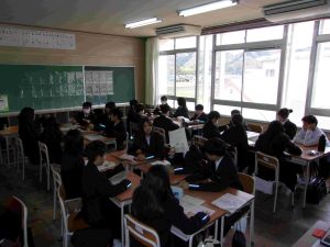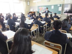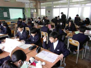 3年生は学級活動で、修学旅行についての説明を受けました。昨年度の修学旅行の様子や、宿泊予定のホテルなどの写真をスライドで見ながら、旅行の行程や注意点について理解を深めていました。