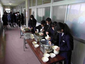 給食の様子です。子どもたちは順番を守って、落ち着いて給食を取りに行きます。