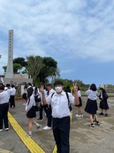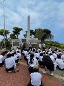 平和祈念公園にて、平和セレモニーを行いました。司会は実行委員の辻森さん、平和宣言は3年生代表の大塚さんが務め、心を込めて発表してくれました。