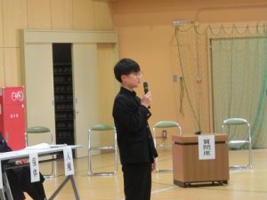 例年通り、全クラスで学級討議を行い、本部や各委員会の活動案・予算案について、質問をまとめていました。代表の学級委員が質問し、執行部が回答するやりとりを行いました。