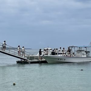 午前中のマリン体験と文化体験は、活動が始まると雨も上がり、予定通りの活動をすることができました。マリン体験は船で少し沖まで出て、海に潜りました。運良くウミガメにも遭遇したようです。またドラゴンボートも体験しました。とても気持ちよかったよです。文化体験は、ストラップ作りとシーサーの模様付けを行いました。着替え後、バスにて民泊先に向かいます。