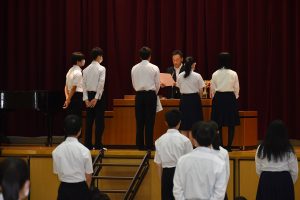 校長からの話では、年度初めに話した『三つのキーワード(「凡事徹底」「聞く姿勢」「take action」)』について、再度確認し、それぞれに「目標」をしっかりと定め、当たり前のことが当たり前にできる自分をしっかりと作っていってもらいたいと話しました。また、2学期は体育大会、東風祭と行事が続きます。「take action」を実践し、学級、学校が一致団結して活動をしていきましょう!