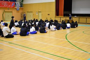 19日(金)の5校時に1年生は「交通安全教室」を行いました。長浜警察署交通課の方においでいただき、交通ルールやマナーについて講話やビデオ鑑賞で学習をしました。