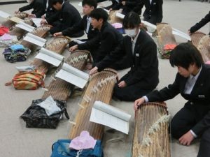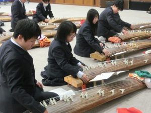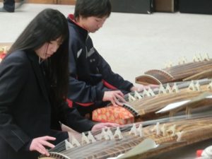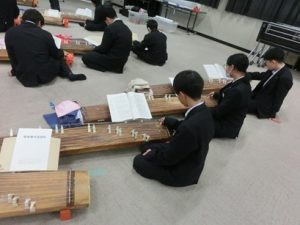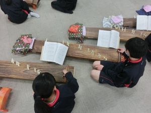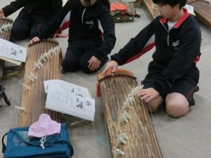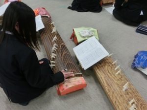 箏(こと)の演奏方法などを教えていただきながら、実際に箏の演奏を練習し、クラス全員で「さくら」を演奏しました。先生方に丁寧に教えていただいたおかげで、とてもよい演奏ができるようになりました。