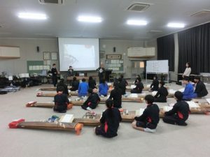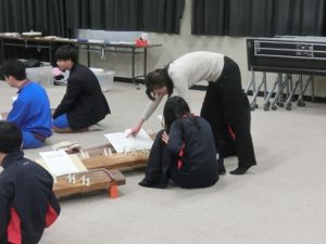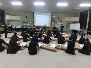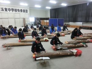 毎年行っている1年生の「和楽器体験学習」を本日、開催しました。2校時にA組、3校時にB組です。講師には、「弥生会」より、田中先生ご夫妻、柴田先生にお越しいただきました。「弥生会」の皆さんには、毎年「立志式」でもお世話になっています。
