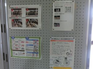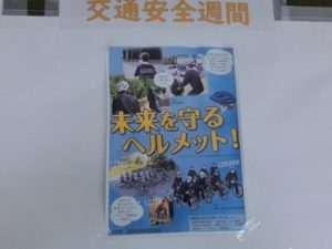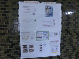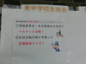 今週は生徒会執行部と学級員会、生活委員会がコラボをして「交通安全週間」に取り組んでいます。今回は「ヘルメット着用点検」をメインとして自転車運転のマナー向上を呼び掛けています。各学年の昇降口にはポスターなどを掲示し、自転車小屋などで点検活動を行いました。