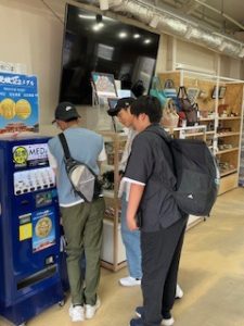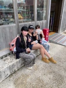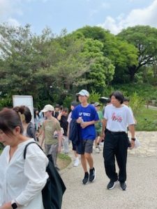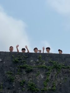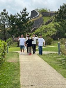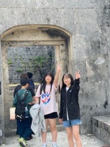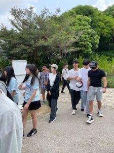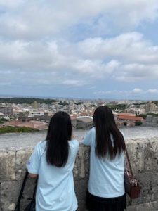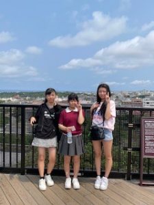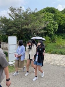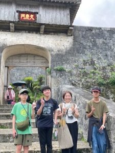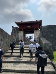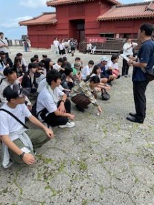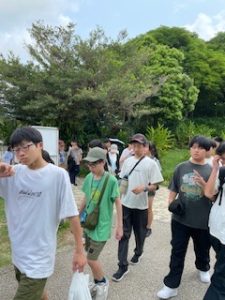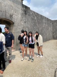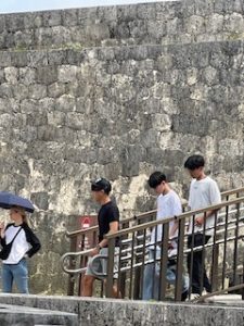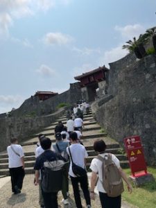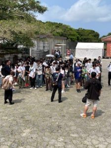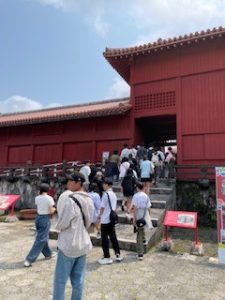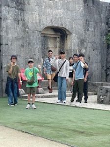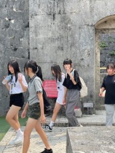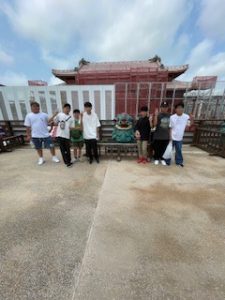 首里城は晴れ。ここでは11:40まで自由見学を行いました。まだ修復工事のため全容を見ることはできませんでしたが、子どもたちは歴史ある建造物を前に、興味深く見学する姿が見られました。売店では、家族や自分へのお土産を楽しそうに選んでいる生徒もいました。
